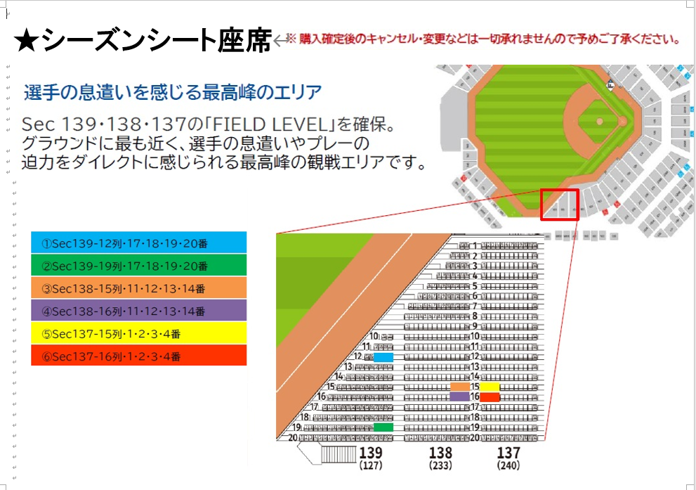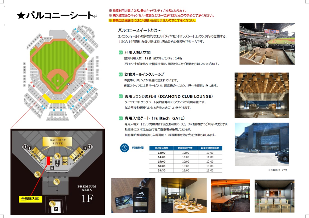 座席はシーズンシート全24席(4席セット×6)とバルコニースイート1試合1室が予約出来ます!!