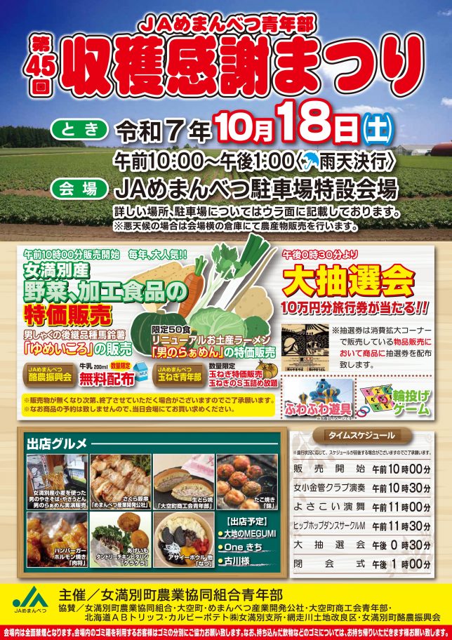 今週の10/18(土)JAめまんべつで第45回収穫感謝祭りが行われます!