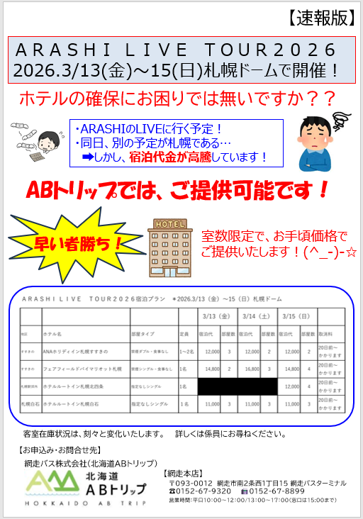 ABにて3/13・3/14・3/15の札幌内の宿泊をご用意!